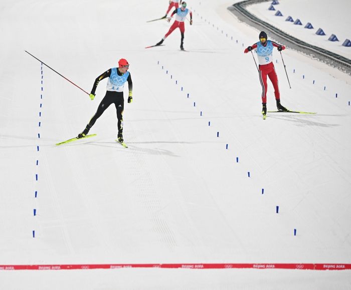 2月9日,德國選手文岑茨·蓋格爾(左)在越野滑雪比賽中沖刺。新華社記者 朱崢 攝